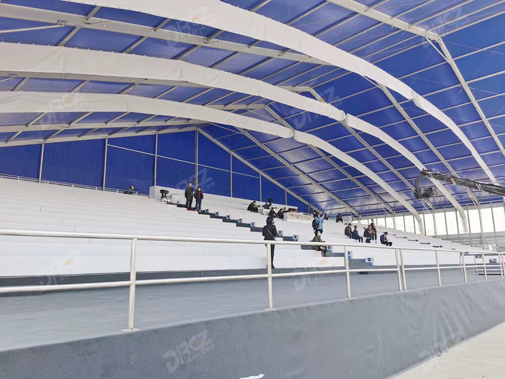 博览馆篷房一般采用跨度40米,边高6米的展棚,面积16000平方米。 展览侧墙采用全透明ABS五金墙体,使展览空间凉爽,为大型展览篷房降温创造新标杆。