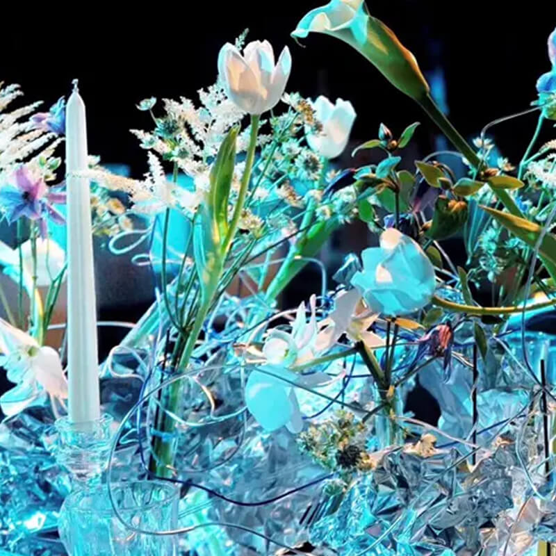 - 氛围布局:餐桌、平台、落地式空调机组、鲜花等